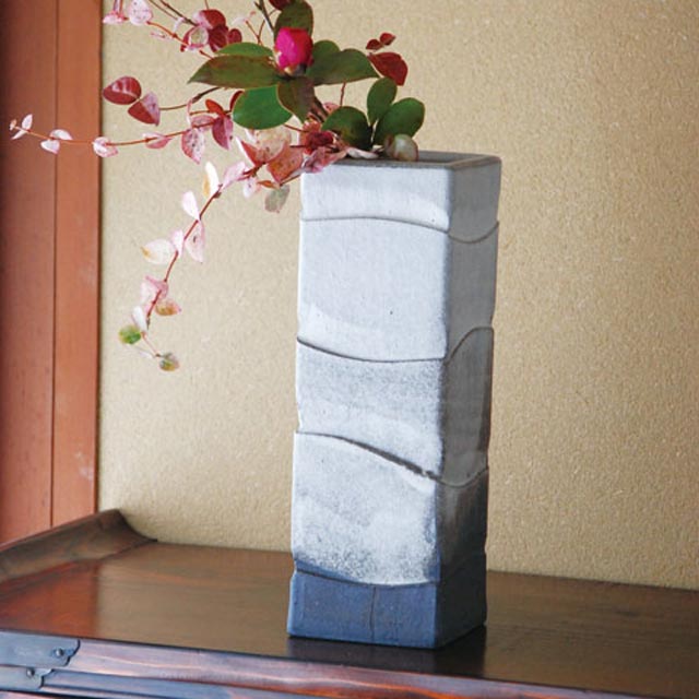 信楽焼きの「灰粉引角花入」 伝統工芸品 しがらき 信楽焼 陶器 陶製 和風 和室 花瓶 花台 華 いけばな 活花 つぼ 壷 壺 ツボ 花入れ 茶室 茶道 和テイスト 華道 花生 フラワーベース アンティーク おしゃれ リフル